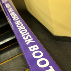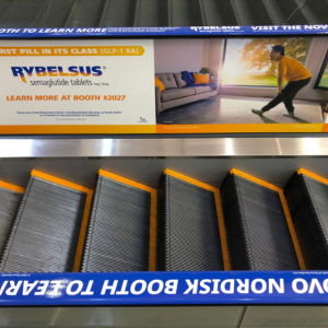 The combination of media was effective in multiple ways from sponsorship exposure, to directional messages, and product information for multiple brands. With the film as a germ barrier, combined with the addition of graphics helping attendees notice speed and direction thus reducing trips and falls, Ad Rail™ handrail media also made the event safer.